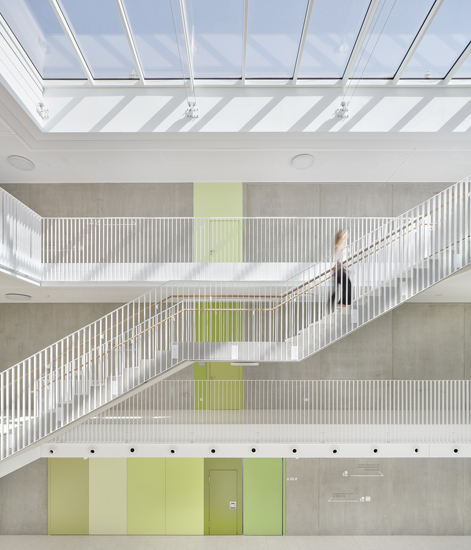 Eine große Haupthalle empfängt die Schüler und bildet den Mittelpunkt des Gebäudes. Alle Klassenräume sind so angeordnet, dass ein freier