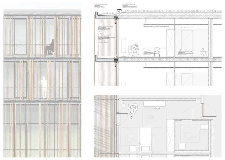Die Pflegebereiche der Stationen gliedern sich in 3 Pavillons und sind baukörperlich über alle Geschosse hinweg ablesbar.