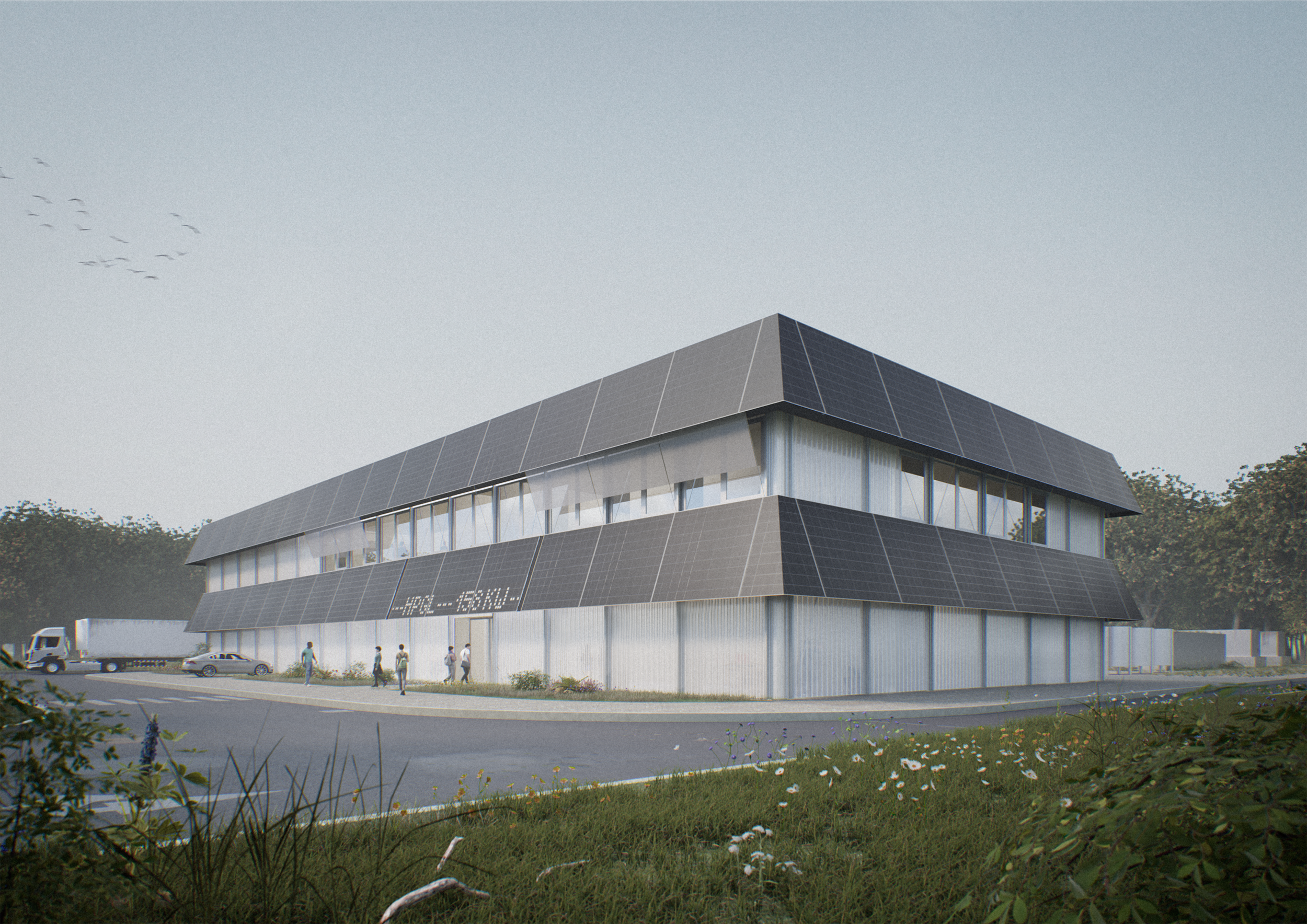Dem vorgestellt wird eine Unterkonstruktion aus Stahl, die mit Photovoltaik-Modulen belegt wird. Über den Tag betrachtet optimieren diese,