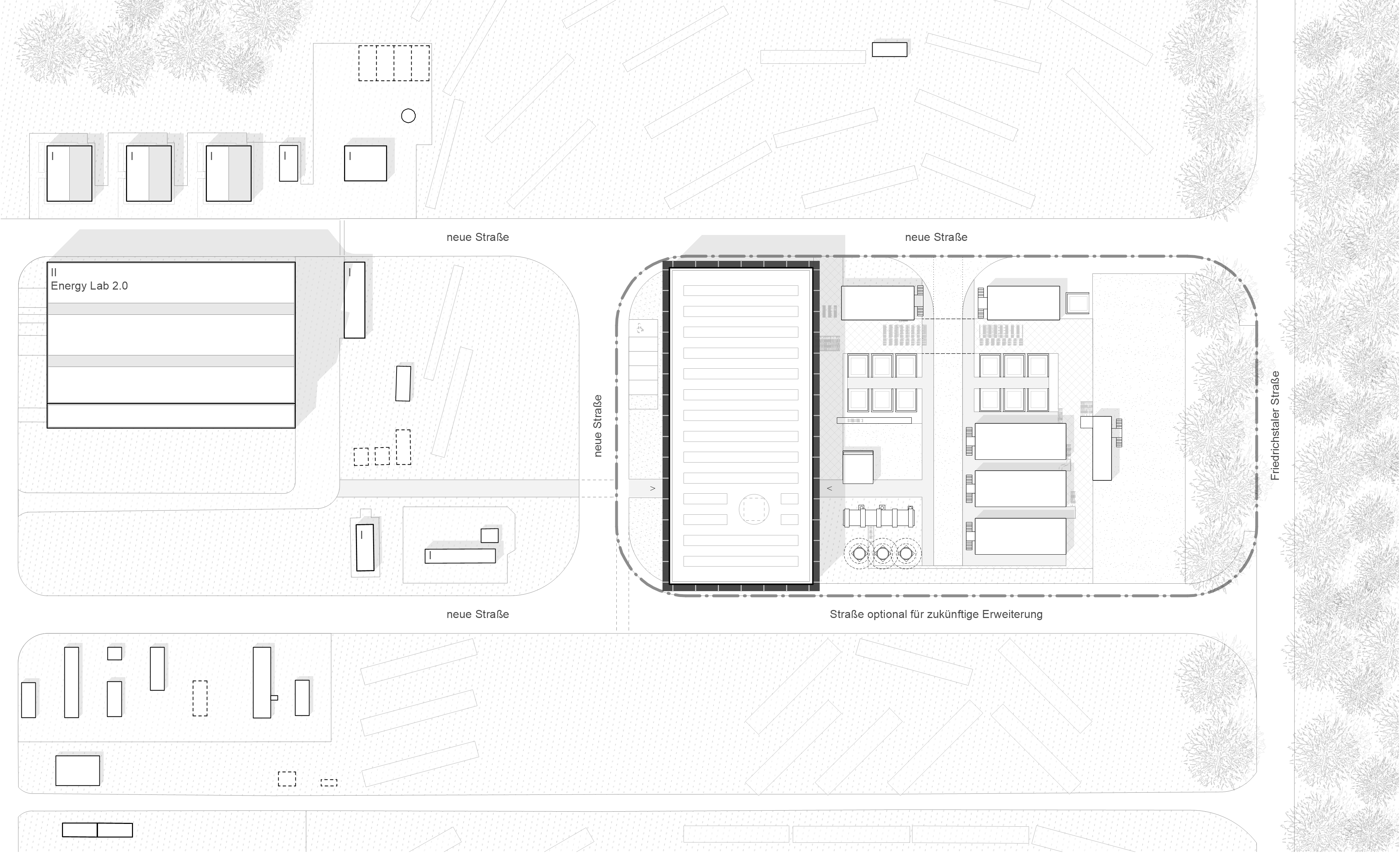 Die Erschließung und die innere Organisation sind möglichst effektiv gestaltet. Eine Erschließungsachse führt vom bestehende Energy