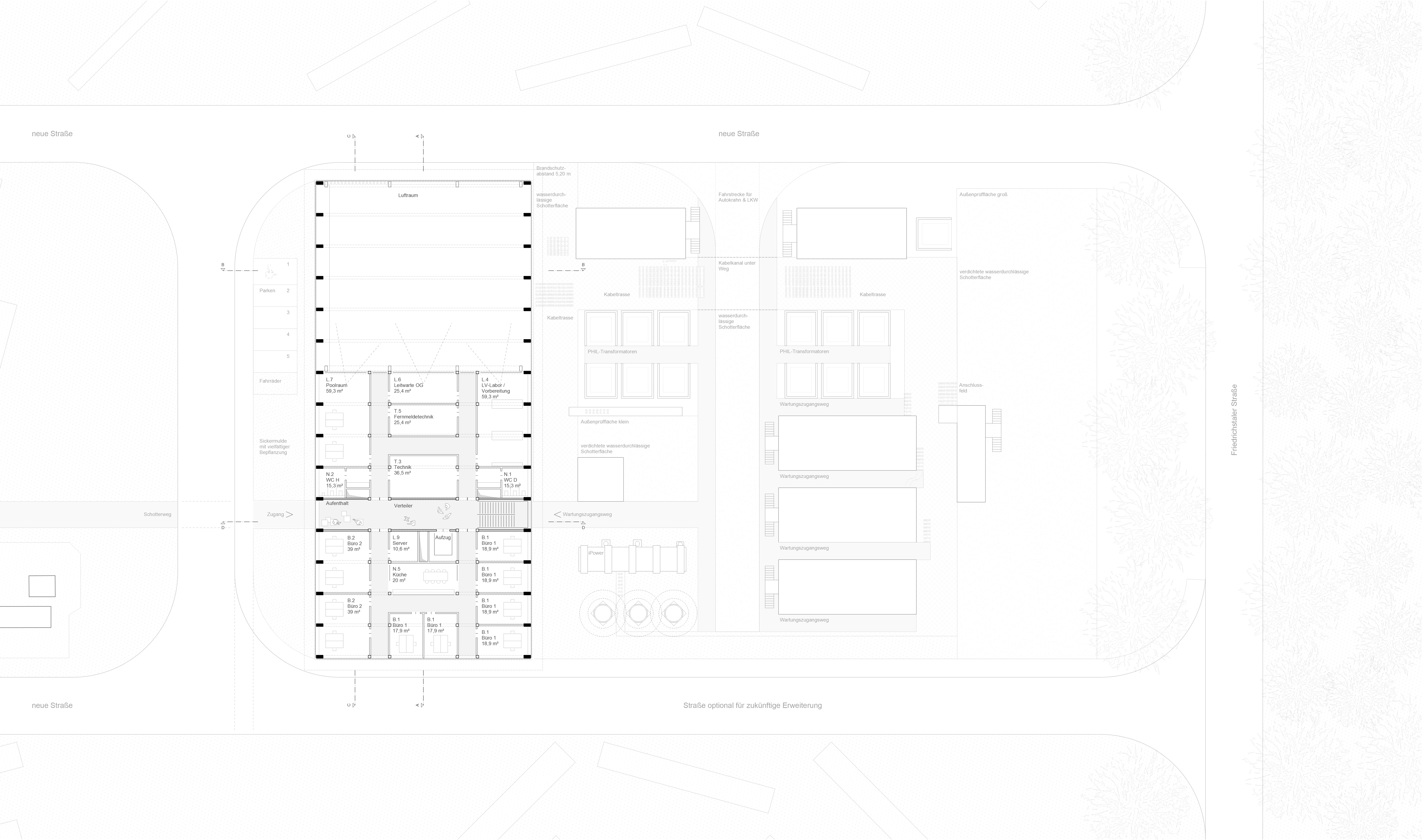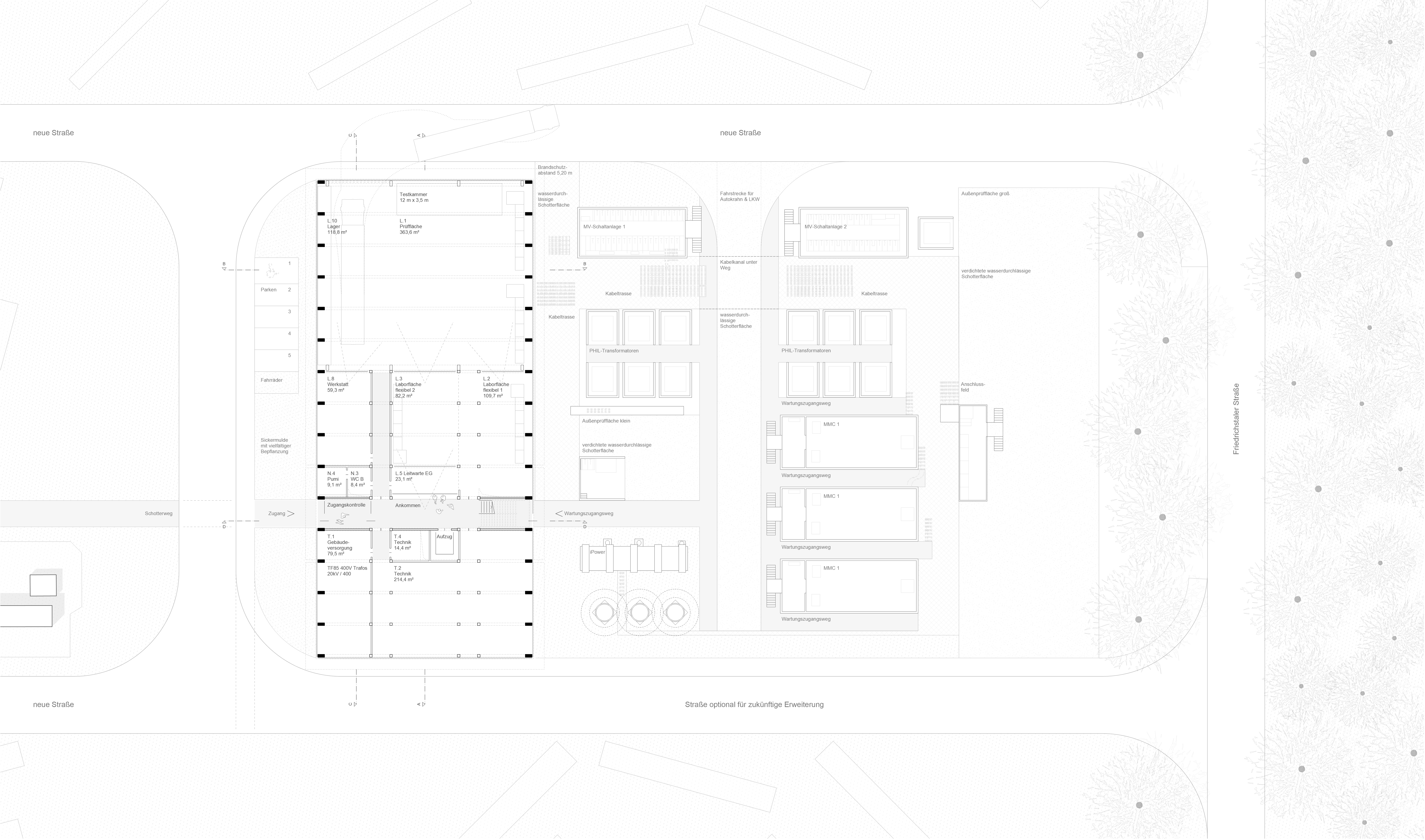 Für die Unterbringung einer großen Prüfhalle, kleineren Laboren, Steuerständen, Leitwarten, Mittelspannungsschaltanlagen, Büros und