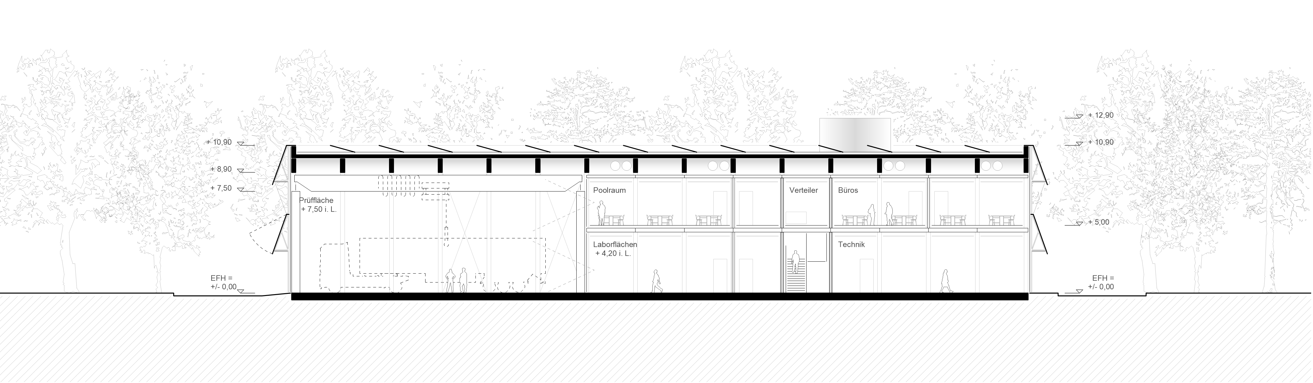 Die Anordnung als effektiver Dreibund mit kurzen Wegen und hoher Transparenz zwischen Prüfhalle und angrenzenden Nutzungen schafft