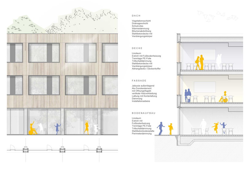 Er nimmt die Orthogonalität des Bestands auf und stellt den räumlichen Bezug zu den verschiedenen Gebäuden her. Zur Zu-Rhein-Straße